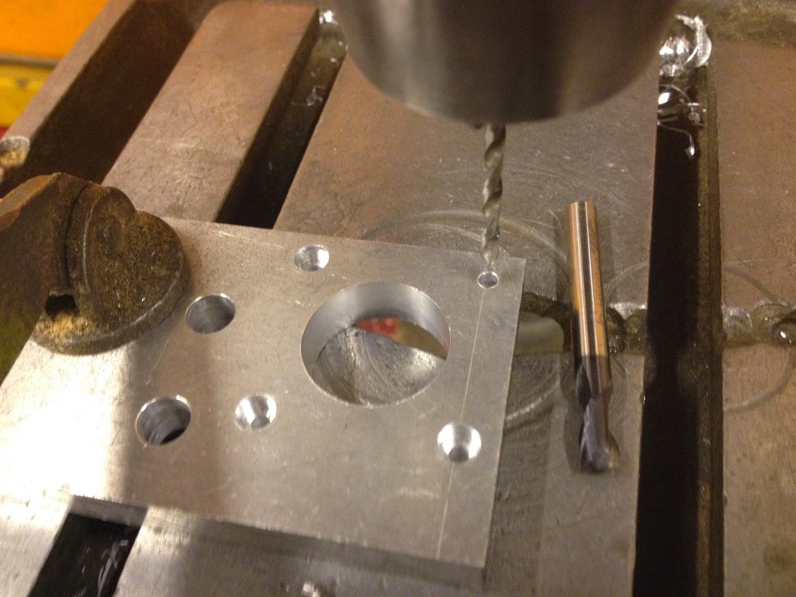 Holes were centerpunched, then predrilled and drilled. I used a 25mm HSS end mill for the large hole. Unfortunately the template fell off in the process, but luckily the holes were all predrilled so the locations were accurate, and I printed out a few so I could stick on another template.